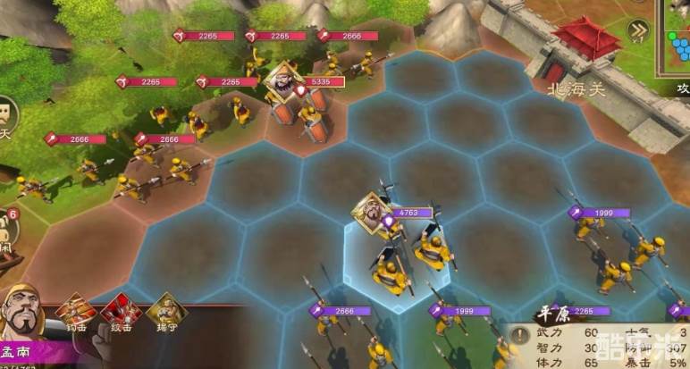 然后先秒掉北面的吕瑁的部队,因为孟南的部队在没有明显攻击的目标时候,会去攻击北海关的城关,等于是变向帮我们城关。解决完吕瑁的部队后,如果想节省时间,可以直接顶着孟南攻击去攻破北海关。