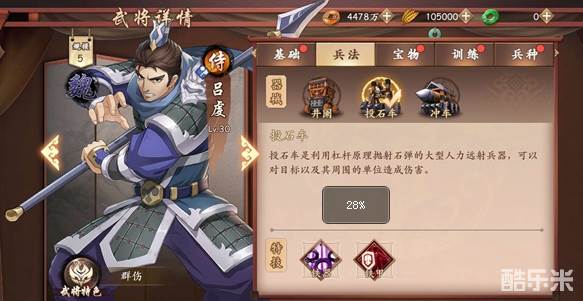 同样是曹操旗下的大将,吕虔则拥有远距离群体伤害,他能在驻扎在部队后方,通过装备【投石车】和【井阑】等器械,给予前线极大的火力支援。而他的特技【铁器】,还能使【井阑】和【投石车】的攻击+20%。这样的吕虔不只是攻击距离远,还能打出高额的群体伤害。