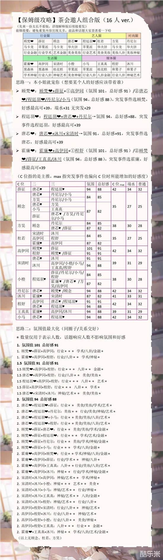 最佳组合徐尉+唐芯+薛征,氛围94,总好感+88,突发选徐尉个人好感最高+39,端水31,无突发29。