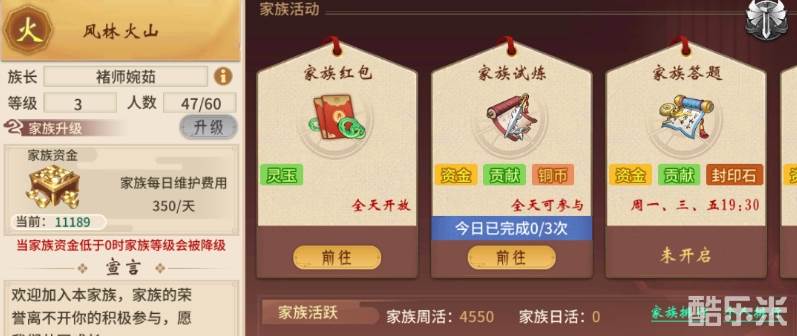 家族试炼这个玩法参与等级还是要达到四十级才行的,在加入一个家族之后,在主界面的玩法中就可以看到了。该玩法是全天都开放的,但是大家要注意,由于试炼是有BOSS设定的,而当BOSS被击杀之后就完成试炼了,所以说参与的话还是尽早比较好,否则的话奖励都是拿不到的。