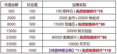 【活动内容】活动期间可通过充值金币获得好运值,积累好运值即可打开宝箱奖励,闪耀称号,全新神器,绝对超值的提升战力资源,尽在特惠好礼。