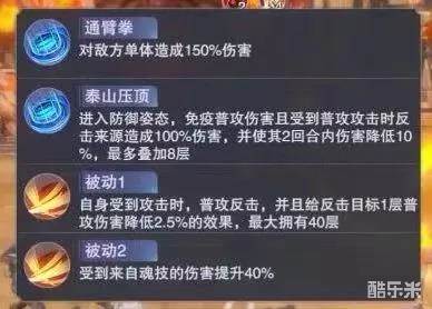最主要的技能作用进入防御姿态后免疫普攻伤害,同时会对普攻来源返还100%的所受伤害,并且使其伤害降低自身受到攻击时会用普攻反击,并给攻击来源施加1层普攻伤害降低2.5%的效果,最大40层受到来自魂技的伤害提升40%,所以打泰坦巨猿不适合用猫队,用邪月队最佳