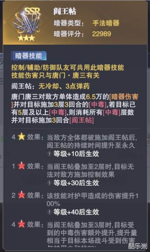 每使用两次此暗器可以对敌方身上附加一层阎王帖buff