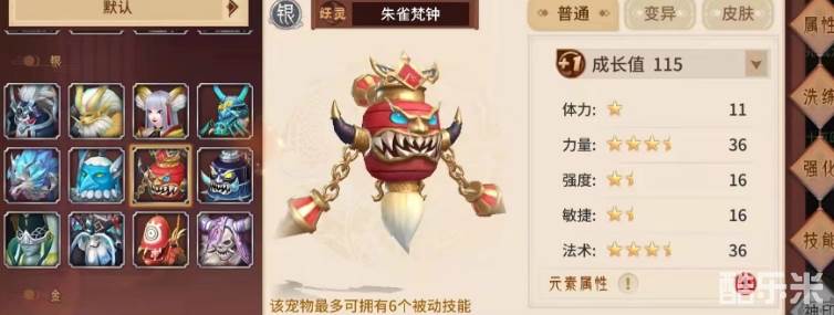 朱雀梵钟:它是火灵珠元素属性,有一个主动技能,梵钟震击,对目标发动一次攻击,造成攻击属性73%的物理伤害和精神属性73%的法术伤害。