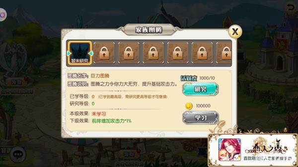 家族图腾代表着你的家族荣耀,每一个图腾都具有不同的属性,像是巨力图腾可以为你提升基础攻击力!开启图腾的研究需要达到一定的活跃值,活跃值可以通过家族捐献中获得。赶紧研习图腾吧,为了家族的荣耀,提升自己!