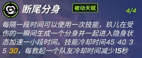 玖儿在受伤的一瞬间生成一个分身并一起进入隐身状态加速一小段时间。每救起一个队友减少一定的冷却时间。