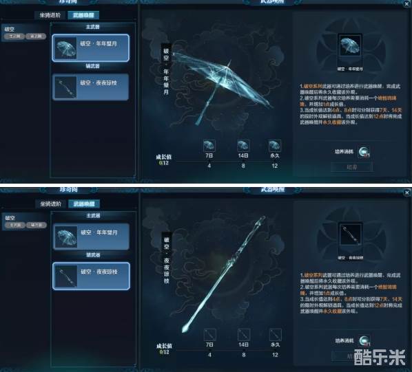 以端游为例,主武器和副武器的外观需要分开解锁。解锁一把武器需要成长12次,每次成长耗费1个绝智琉璃魄。