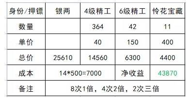 共收入25610银两,364个4级精工,42个6级精工,11个怜花宝藏,所有物品选择出售的情况况,减去14个镖旗成本,一共可以获得43870银两。