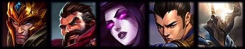 3、T2:德玛西亚皇子-嘉文四世、法外狂徒-格雷福斯、堕落天使-莫甘娜、德邦总管-赵信、不屈之枪-潘森。
