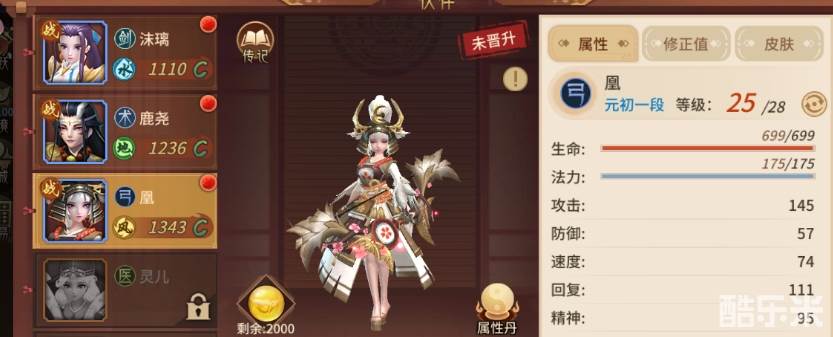 凰这个伙伴在初始的品级上是元初一段,简单来说就是一个蓝色品级的伙伴,这个品级的话属性能力上还是有一些设定的。凰在职业的设定上是一个弓手,也就是战斗中是担任输出的,默认的输出属性是地属性,可以克制水属性的敌人。