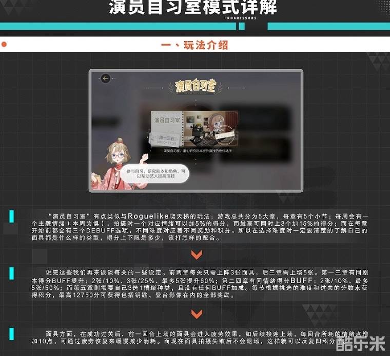 1.演员自习室总共分为5大章,每章有5个小节;每周会有一个主题情绪(本周为惧),拍摄时一个对应情绪可以加5%的得分,而最高可同时上3个加15%的得分。