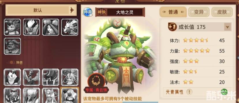 大地之灵这个宠物的技能设定是非常强力的,除了两个自带的专属技能之外,还会带有两个高级技能,这两个高级技能一般都是必杀和偷袭的。神级宠物最高是可以获得九个被动技能提升的,实战中可以获得不错的属性加成。