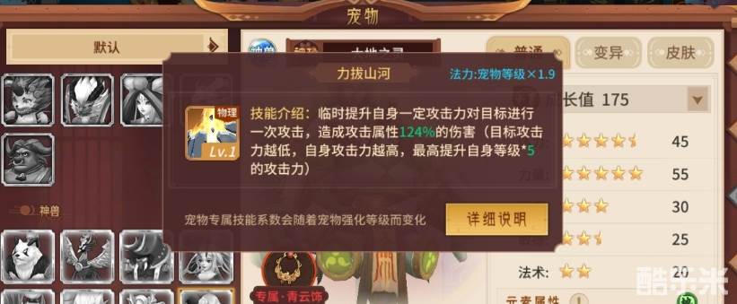 先来看一看专属技能的设定,第一个是“力拔山河”,该技能使用之后会提升自己的攻击力,对单个敌人造成百分比的属性伤害。如果说目标的攻击力很低,那么自身的攻击力也就越低。该技能最高会提自身等级乘以5的攻击力。