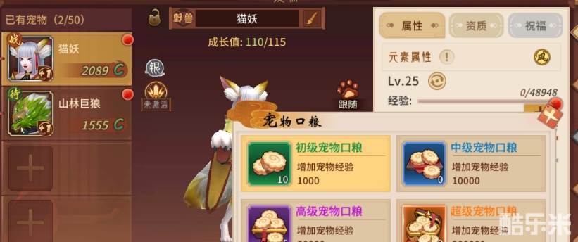 第二个方式就是使用道具来进行提升了,在宠物的培养界面中,玩家点击经验条旁边的加号按钮,就会弹出经验道具的选择。在这里可以选择使用一次,也可以选择使用十次。也有一键升级的选择。宠物的口粮道具是分为四个品级的,不同的品级带来的经验值提供是不一样的,这些道具可以通过一些日常的玩法和挖宝来获得。该方式只要有足够的道具,那么效率是相当快速的。