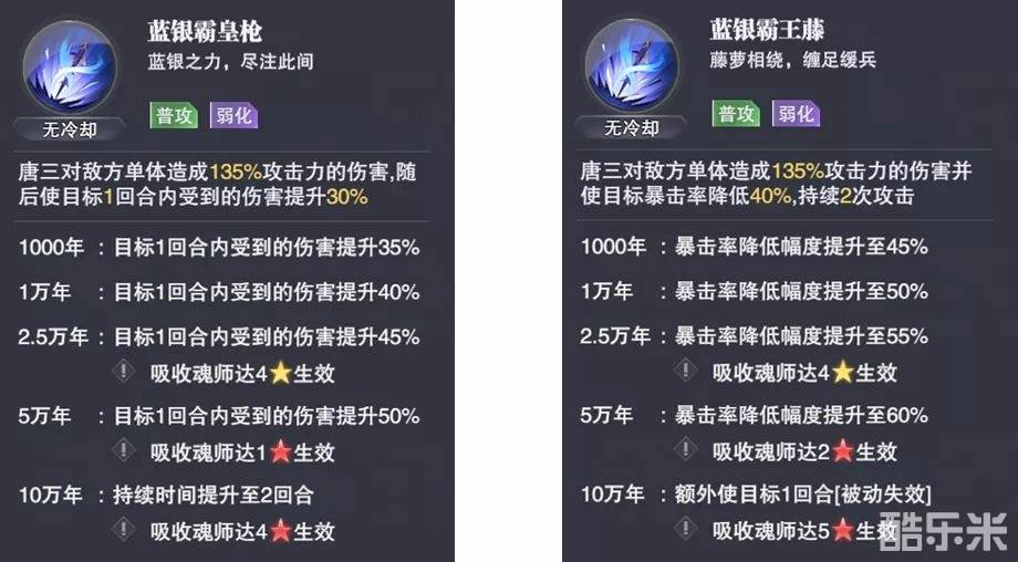 【蓝银霸王枪】的主要效果是增伤增伤增伤......50%持续2回合的效果也是很不错的,这也是让蓝银皇唐三具备打长图能力的最大原因