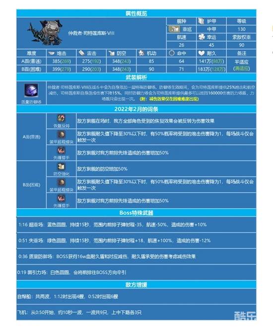 BOSS的属性和特殊技能如图(感谢5B5大佬提供的数据及原图),到目前为止三个BOSS均为高等级高机动高幸运,因此命中、闪避相关的装备和拐需要引起重视,其子弹以通常弹为主,因此对于前排承伤优先度,重甲>中甲>轻甲。50秒开始连续飞机增援,航母队前两波隐蔽问题不大,第三波空袭想保隐蔽十分困难。0:36左右BOSS获得耐久盾,除了顶配日航队以外,其他队伍很难破盾,外加困难词条BOSS对前排的增伤,前排生存时间有限,因此从开局到0:36约54秒时间基本上就是每队的有效输出时间。BOSS仍然有残血概率免疫炮击的词条,因此依旧是炮队先上,航队收尾。