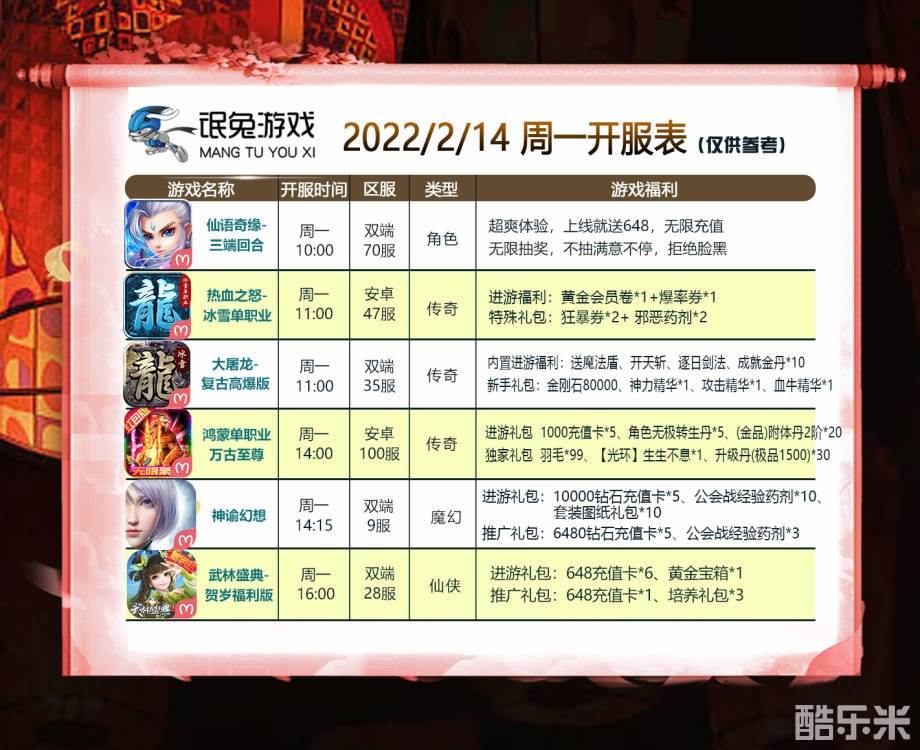 | 仙语奇缘-无限抽 | 天下70区( 苹果- 安卓) | 2022-02-14 10:00:00 |