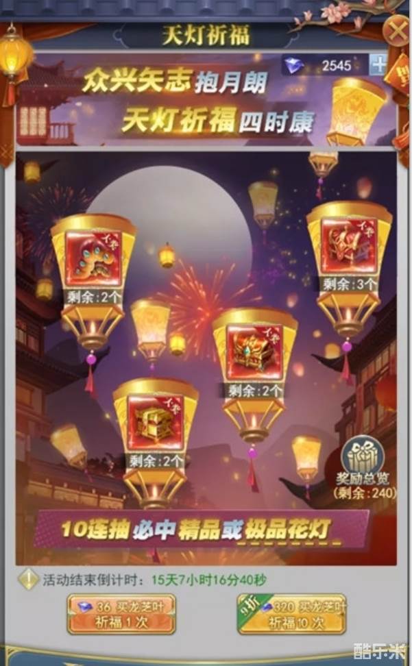 花灯有三种品质:极品花灯,精品花灯,普通花灯。十连抽必中极品花灯或精品花灯。