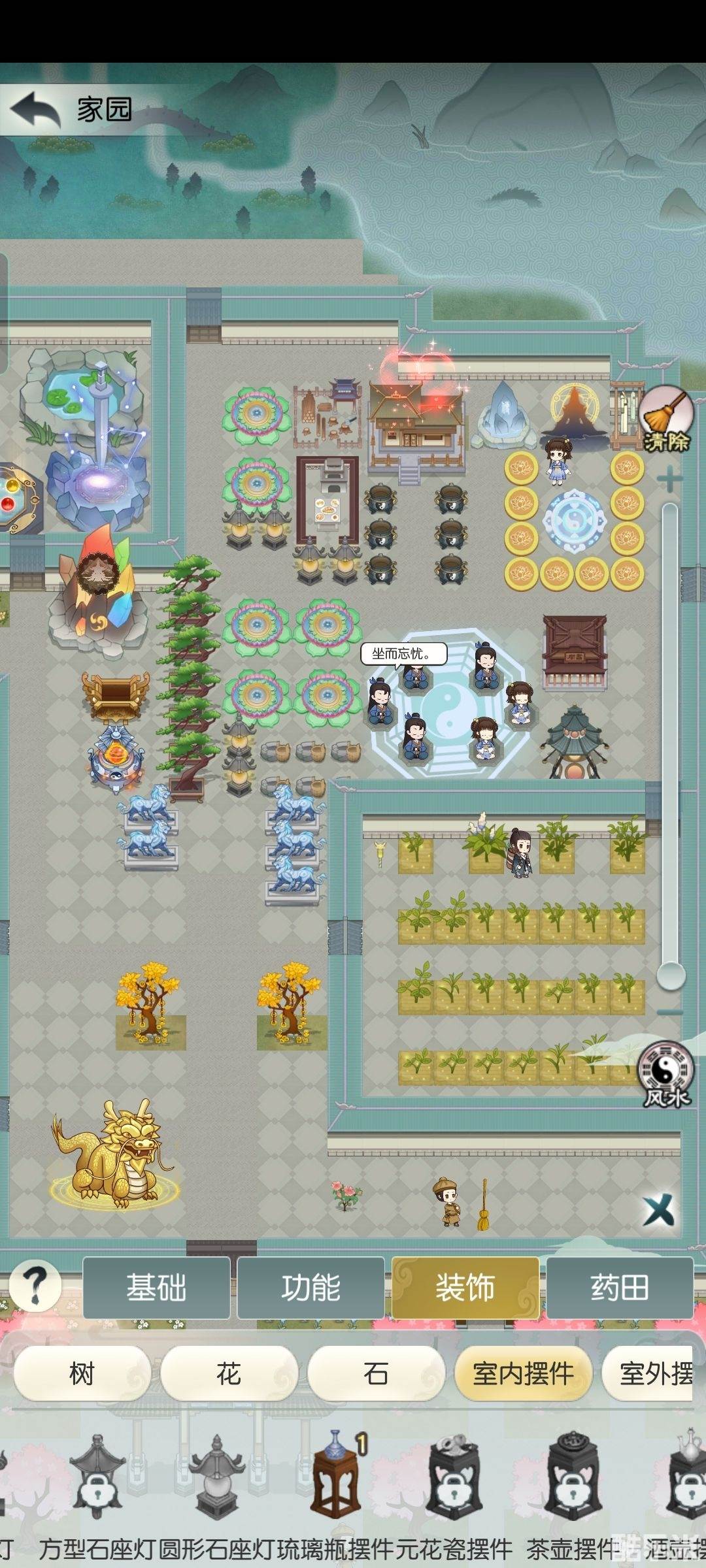 还有一个聚灵阵盘,黄色的小蒲团尽量放在周围,这样弟子传功的时候才有显示效果。其他的根据每个人的喜好随意发挥,现在更新后水上也可以摆放了,位置宽阔好多,前提必须先铺设地板