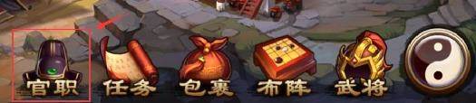 官职功能会在玩家达到35级后开启,点击主界面下方的官职按钮便可进入官职界面。武将的初始官职均为兵卒,通过消耗功勋或宝玉培养官职等级,增加官职加成属性。武将功勋可以通过挑战秘境试炼里的决战紫金山获得。