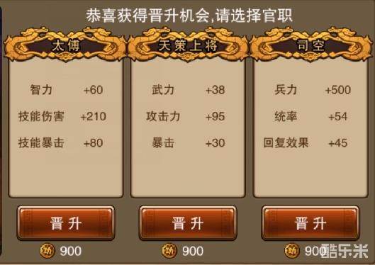 当官职达到10级后便可以晋升更高阶的官职,晋升时我们会提供3条路线给玩家选择,以下是不同路线带来的属性加成: