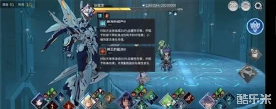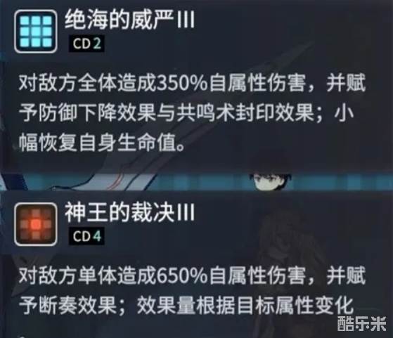 这个boss的一技能是群体aoe伤害,防御下降共鸣术封印(两回合),同时小幅提升生命值。技能二不可被延时,必定发动,单体高额伤害,同时调律获得量降低(跨属60%)。