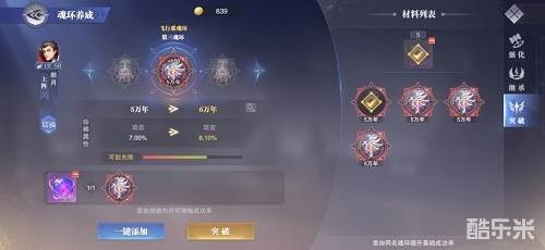 1、魂环突破功能开启等级为56级,魂环突破需要用的材料为内丹加五万年魂环,只有五万年及以上年限的魂环可参与突破,且作为突破材料的五万年魂环必须和本体魂环为同系魂环;魂环突破成功率的问题随着放入五万年和内丹数量的增加,魂环突破的成功率也会越来越高,成功率上限为百分之百;