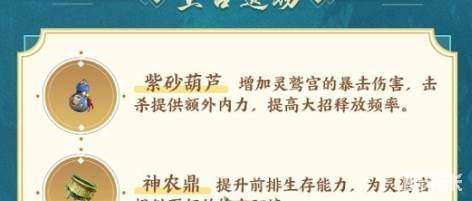 1、紫砂葫芦:增加灵鹫宫的暴击伤害,击杀提供额外内力,提高大招释放频率。