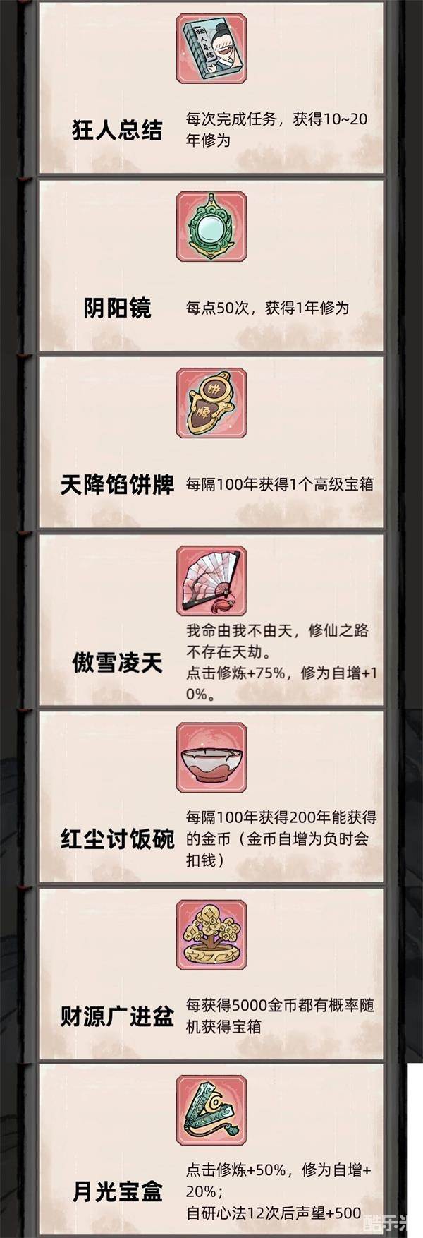 优先度的话,个人觉得是加修为自增百分比的神器,跟那种完成指定条件直接给你几年,几十年修为的神器比较优先(要自研心法的就算了)