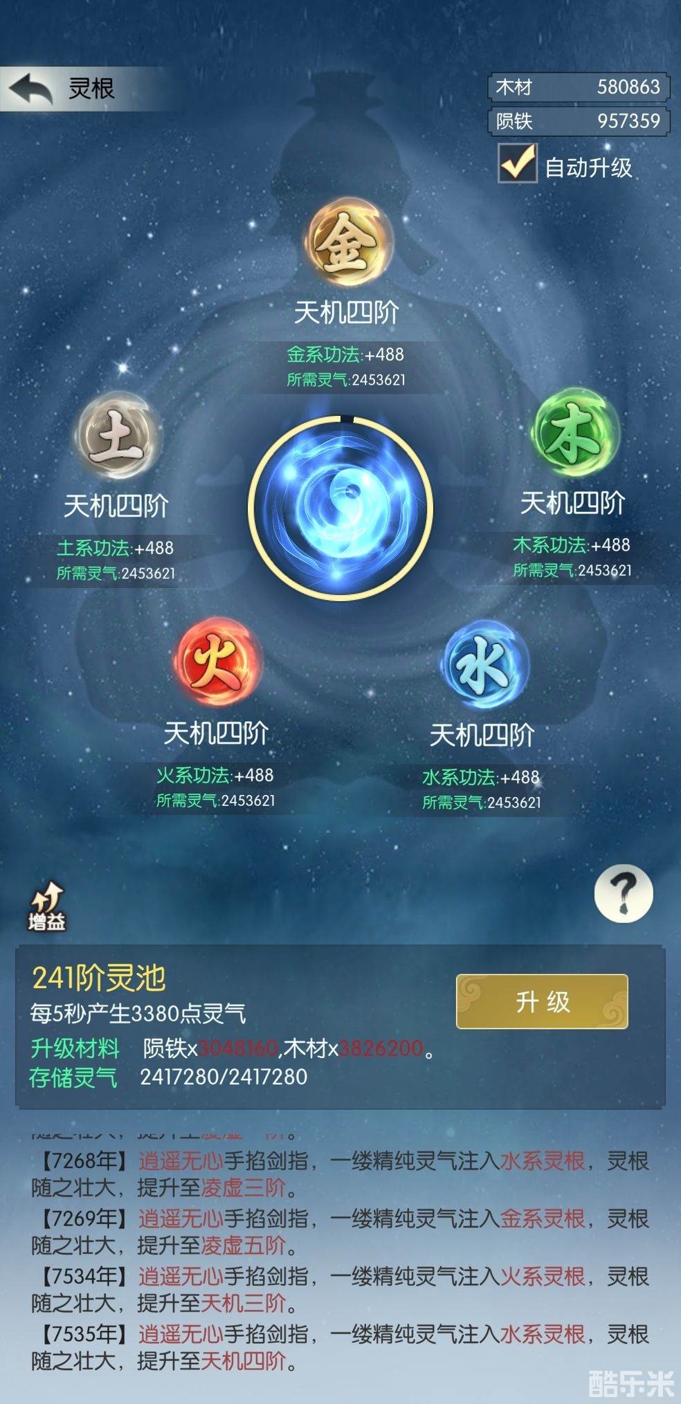 接下去重点来了,大家知道家园开了后,灵池最后下暴击是可能溢出的,这个时候就可以直接升一个灵根了,所以通过七星阵升级,或者门派的宗门功法升级消耗点灵气,灵气满的时候是可能暴击溢出的。