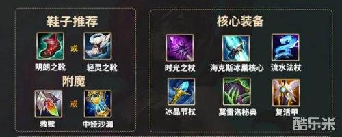 接着出冰杖,配合莫甘娜的2技能,能够减速敌人,最大程度的消耗敌人。最后出流水法杖和莫雷洛秘典,流水法杖配合莫甘娜的3技能,能够减少队友的技能CD、增加队友的法术强度,莫雷洛秘典在面对敌方有较多回复技能时,是一件必出的装备,且生命值低于50%时,减疗效果会提升至60%。也可以出复活甲,提高莫甘娜的团战容错率。装备推荐不固定,根据对局的情况,灵活选择。