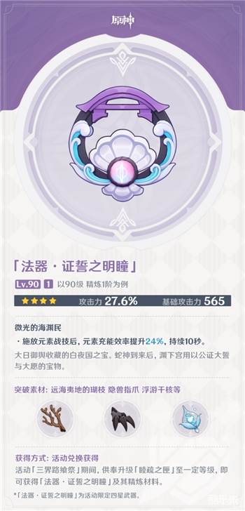 由2.5版本活动赠送的法器,由于其高白值与百分比攻击的副词条,加上释放元素战技后提升充能的被动,也是非常适合八重神子的一把武器
