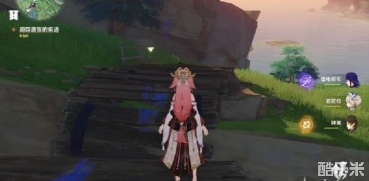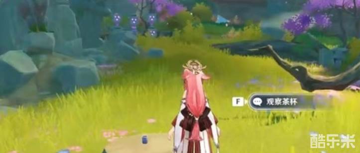 1、首先我们需要到达茶杯这个位置,然后向前方左侧有三个紫色柱子的地方移动。