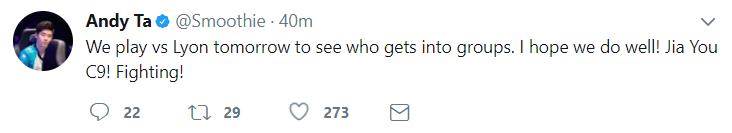 我们明天就要和Lyon打了,这将决定我们谁能成功晋级小组赛。我希望我们能发挥出色!加油 C9! Fighting!