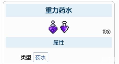 首先重力药水由【水瓶+火焰花+死亡草+闪耀根】,在放置的瓶子/炼药桌上合成而来的。