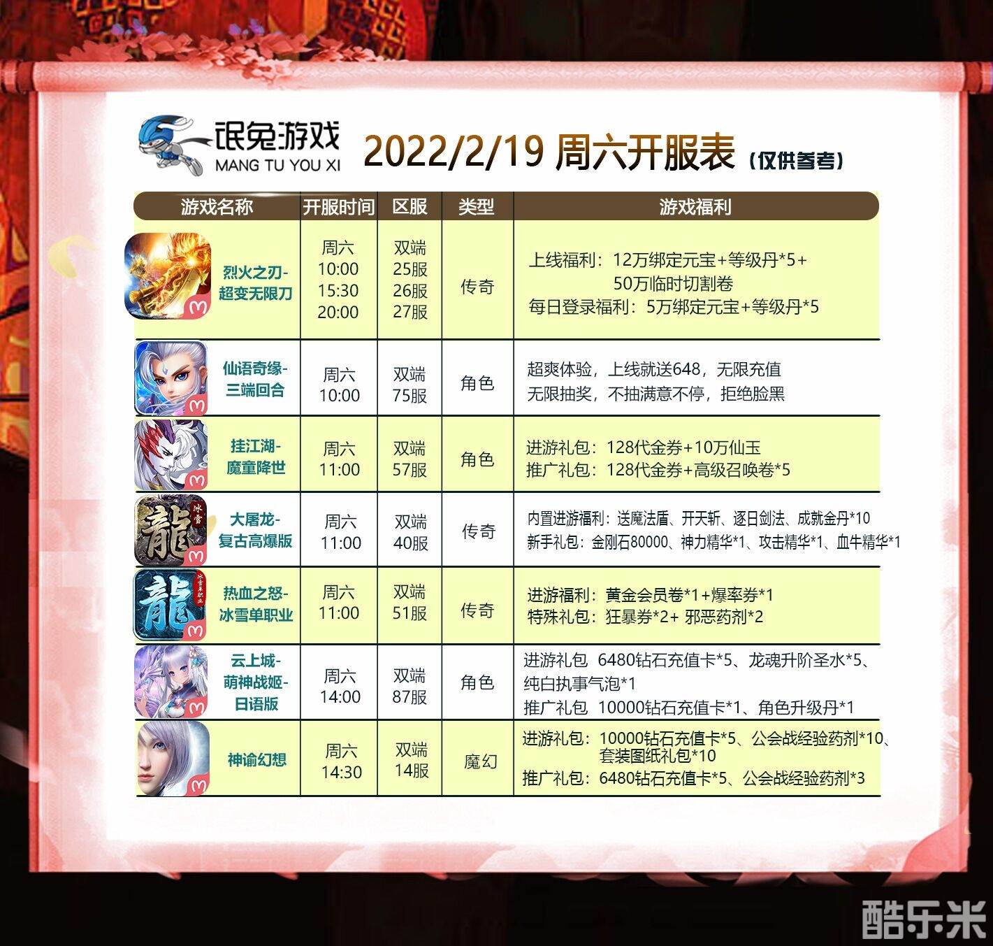 | 仙语奇缘-无限抽 | 天下75区( 苹果- 安卓) | 2022-02-19 10:00:00 |