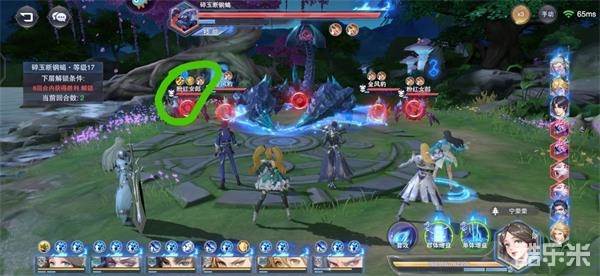 第一波七宝之攻拉尘心开聚环。此时尘心的自动普攻打的必须是头上有标记的小怪,否则重开。需要打掉一格血,不然后面会秒不了。