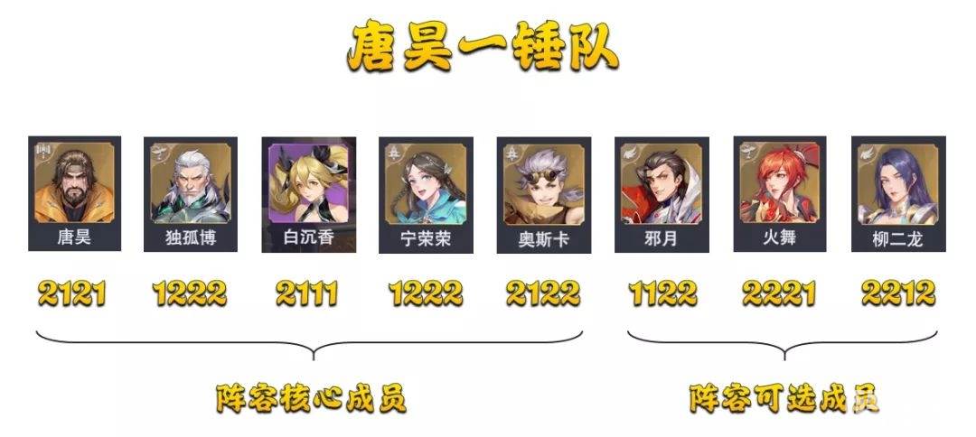 首先这个阵容最重要便是唐昊的一锤子买卖,锤死和锤成重伤都是我们可以接受的结果,所以唐昊的星级一定要高,利用第1回合或第2回合4技能【大须弥锤】的威力对敌方进行毁灭性的打击,这里特别注意2技能推荐的并不是首回合加伤的【昊天之心】,这是因为在面对独孤博队伍时,唐昊首回合需要用普攻来概率废掉独孤博的被动2技能【诛心】,借此来解除其减少我方伤害的效果,所以我们唐昊的2技能更加推荐的是【铮铮铁骨】