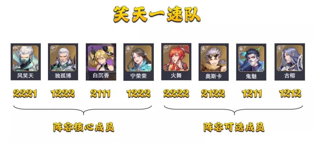 考虑到风笑天在开启4技能【疾狼奔袭】之后获得的【极速】状态可以大概率免疫控制,因此此阵容的关键也是在于抢一速上,如果能抢到一速让我方的风笑天快速行动进入【极速】状态,则胜利的天平便会像我方慢慢倾斜