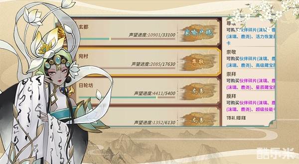 讲到伙伴系统还有一个不得不提的便是声望系统,在游戏中不同地域的声望度将会影响到在当地声望商店可购买的物品种类与数量,为什么说与伙伴系统息息相关呢,就是因为我们伙伴晋升必备的碎片、以及觉醒所需的觉醒石都是要在声望商店里购买的,结合前面所说重点培养的伙伴,建议大家在获取到自选声望卡的时候,可以优先去提高宛村(达到“中立”可购买伙伴沫璃、鹿尧觉醒石)、玄都(达到“一鸣惊人”可购买伙伴姜子牙觉醒石)以及日轮坊的声望度(达到“中立”可购买伙伴凰觉醒石),那么声望卡如何获得呢?这又回到了我们最开始的起点啦~多在大地图上逛逛你就知道好处了哈哈~