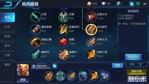 六神装:无尽战刃、抵抗之靴、宗师之力、破甲弓、闪电匕首、破军
