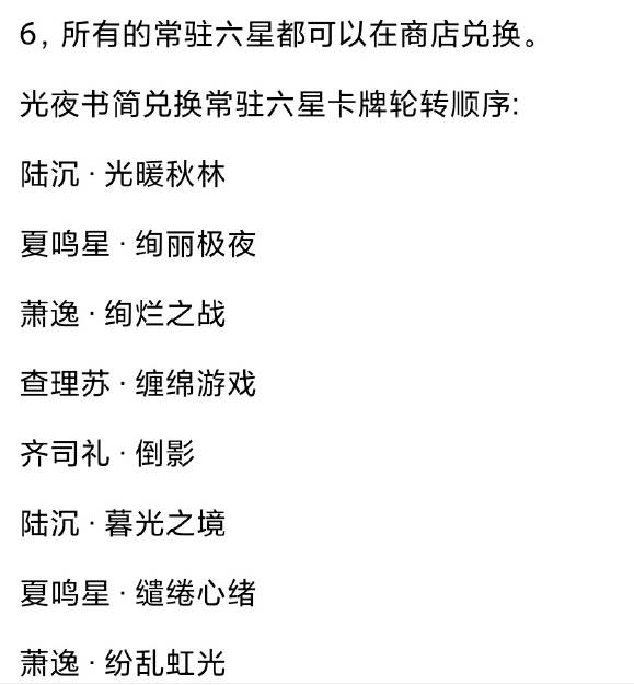 光夜书简兑换常驻六星卡牌轮转顺序: