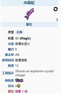 水晶蛇是一种困难模式魔法武器,它有0.5%(1/200)的机会由钓鱼在地面、地下或洞穴地层的神圣中获得。