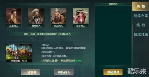 跟着商社商人走,一定少不了好东西,在策略游戏卧龙吟中,商队有着让装备变强的刻纹,同行的商队人数越多,收集到的刻纹数量和品质也会越好,毕竟人多好办事,每天都有12次免费的派遣次数,各种主公们,一定要不断的去刷新,直到刷新出4位商人为止,这样就可以得到更多数量、品阶高的刻纹哦。