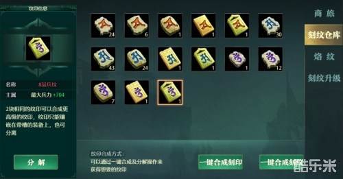刻纹分别主掌攻击、防御、兵力,同类的刻纹只能装在装在一件装备上,两枚同级的刻纹放在一起合成,就可以升级为更高一级的刻纹,刻纹品阶越高,增加的攻击、防御、兵力也越大,同时也可以增加战斗力,到达一定级数的刻纹,可以合成出更强的烙印,?烙印不损伤刻纹,而且还可以随意和装备分离,就看各位主公如何灵活运用哦。