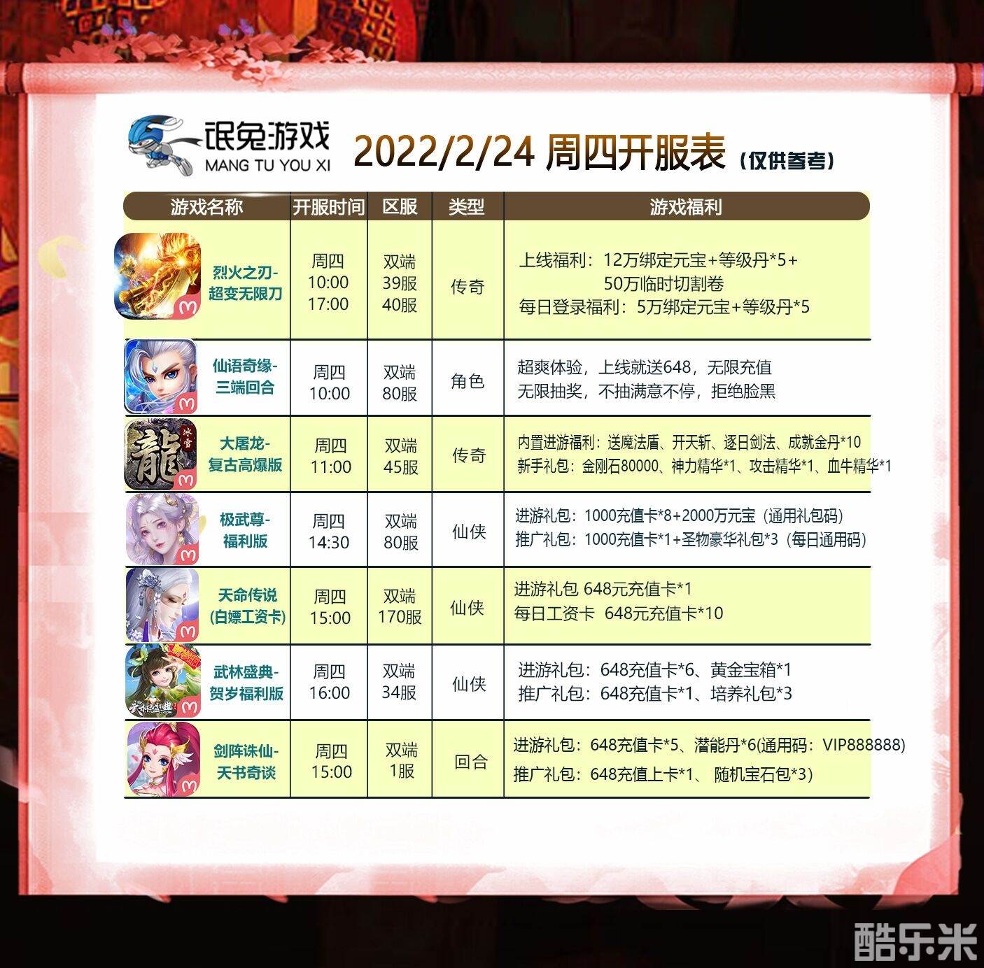 | 仙语奇缘-无限抽 | 天下80区( 苹果- 安卓) | 2022-02-24 10:00:00 |