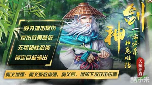 剑神是《侠客风云传OL》综合性侠客,是广为江湖武林侠客传颂的绝世高手,曾一人一剑击败武林十大高手,被武林人士尊称为剑神。为了追求无上剑道,剑神洒脱江湖、四处云游,三尺青锋神乎其技,剑气纵横分流断水。在本次剑神返场活动中,其奥义也得到了再一次加强,释放奥义后会增加下次攻击的伤害!真正做到了一击必杀、神鬼难当!开启天赋的剑神,还会降低反伤效果,可作为强力破核点出战!