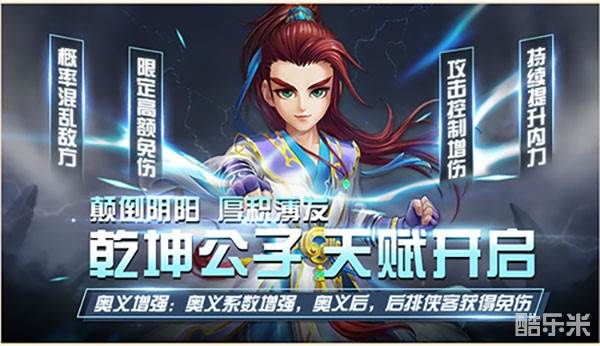 乾坤公子是天王侄儿,风流倜傥且为人谦逊。他自幼习武、天赋秉异,任何武学看上一眼便能够学的八九不离十。《侠客风云传ol》中,乾坤公子具有概率混乱敌方、限定高额免伤、攻击控制增伤、持续提升内力等战斗特点,其奥义阴阳合击为群体攻击,有40%几率使目标混乱1回合,随机攻击敌我目标。天赋开启后将再次增强奥义“阴阳合击”,奥义系数增强,释放奥义后后排侠客将获得免伤。