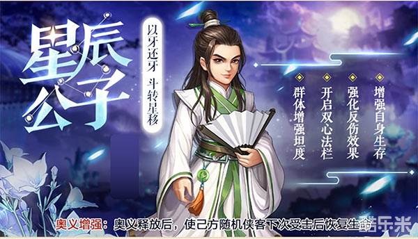 星辰公子本是西域王子,为抵御蒙古部落入侵,保卫家国社稷,特前来大明寻找帮助。在《侠客风云传ol》中,星辰公子作为功能型侠客,奥义星罗棋布可以敌方站位号最小的一名侠客移出场外,奥义释放完成,使己方1名随机侠客下次受击后恢复30%最大生命值,让续航能力再次得到提高。