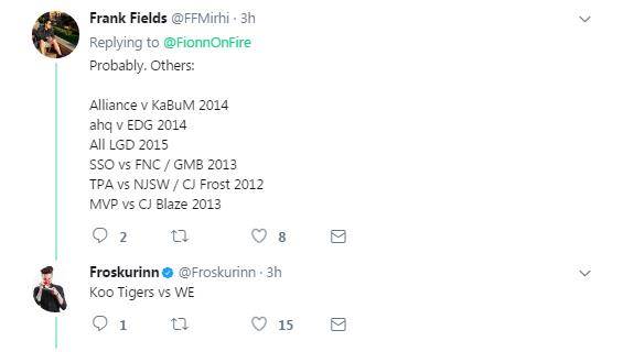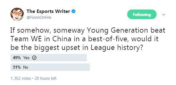 我们都很熟悉的ESPN记者Fionn,在推特发起投票:如果万一的万一,在BO5中YG战胜了WE,将会是英雄联盟史上最大的翻车/失望吗?